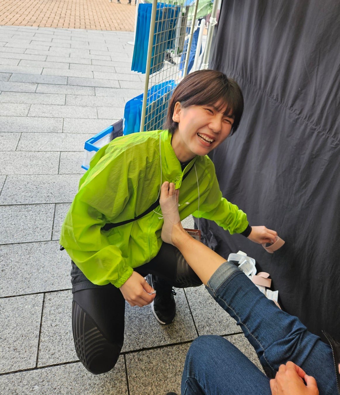 1日目はランナー向けのランニングタイツなどの商品を、2日目は応援する方向けの発熱ウォーマーなどの商品をブースに並べました。ランナーのみならず、沿道に立つ方も支えたいという思いで2日間販売させていただきました。テーピングを貼るサービスについては、当社自慢のテーピング「アクションテックス」の機能を確かめていただき、ランナーに元気をお届けしたいという思いで始めました。ランナーから、「不安だから貼ってもらいたい」という声もたくさんあり、無事に走り切れるようにと願いを込めて貼らせていただきました。少しでもランナーの不安が軽減されていると嬉しいです。