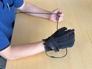 人工筋肉の技術を応用した別の製品、『DARWINGパワーアシストグローブ』もご用意しています。実際に試着し、空気の力で握力をアシストする機能と支援力を体験していただけます。