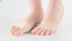 指を通し、かかとにベルトをかける構造で縦アーチを整え、足底の負担を軽減します。